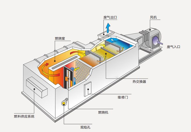 Direct-fired incinerators can be comprehensively designed based on the volume, composition, concentration, and required removal efficiency of the exhaust gas to be treated. The furnace is heated to a set temperature using fuel, after which the exhaust gas to be treated is introduced. At high temperatures, pollutants such as VOCs oxidize and decompose into CO2 and H2O, releasing a significant amount of heat energy. The heat energy carried by the purified high-temperature flue gas can be recovered through external equipment like heat exchangers and boilers, achieving energy savings and reduced consumption. When the concentration of the exhaust gas to be treated is sufficiently high, zero fuel input can be achieved, as the heat generated by the oxidation of the exhaust gas itself can maintain the furnace temperature, thus achieving heat self-sufficiency.