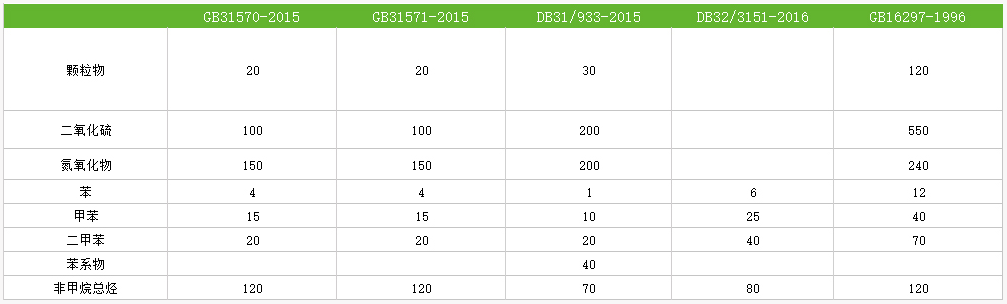 部分国标和地标中关于大气污染物允许排放浓度限值:浓度单位:mg/m3